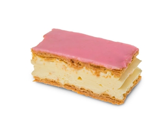 Krakend vers bladerdeeg gevuld met een laag banketbakkersroom en een laag slagroom. Afgewerkt met roze fondant