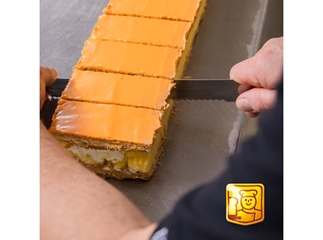 Verse plakjes bladerdeeg met daartussen een laag banketbakkersroom en een laag slagroom. Bovenop Oranje fondant